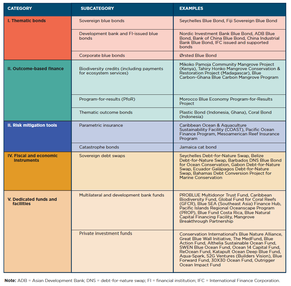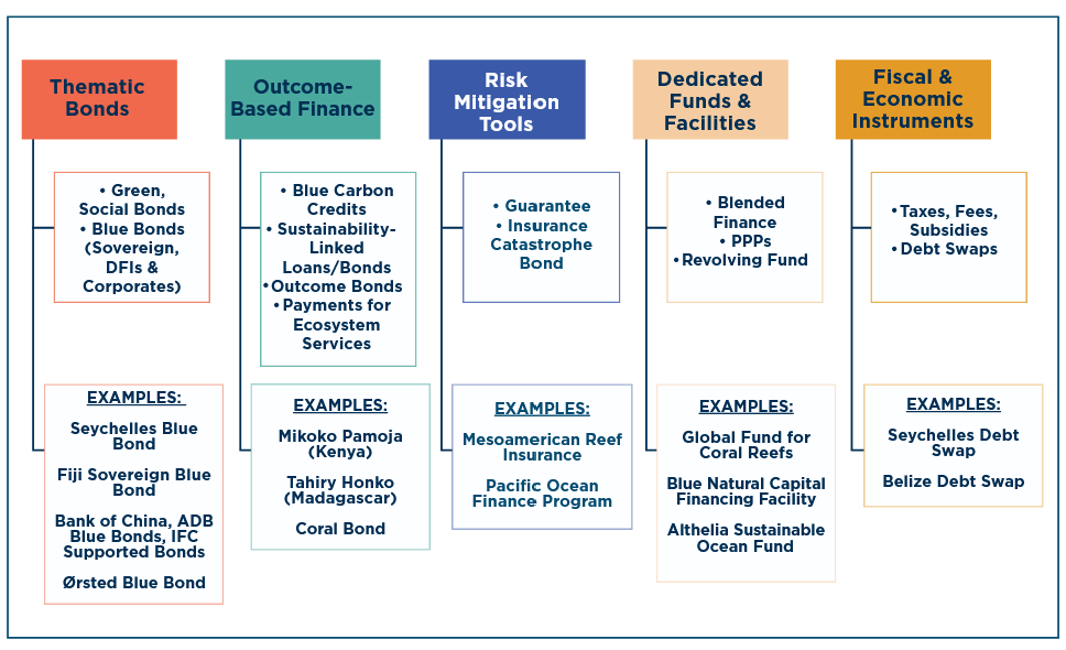 The report identifies five broad families of blue-finance solutions, each mobilizing capital through distinct pathways.